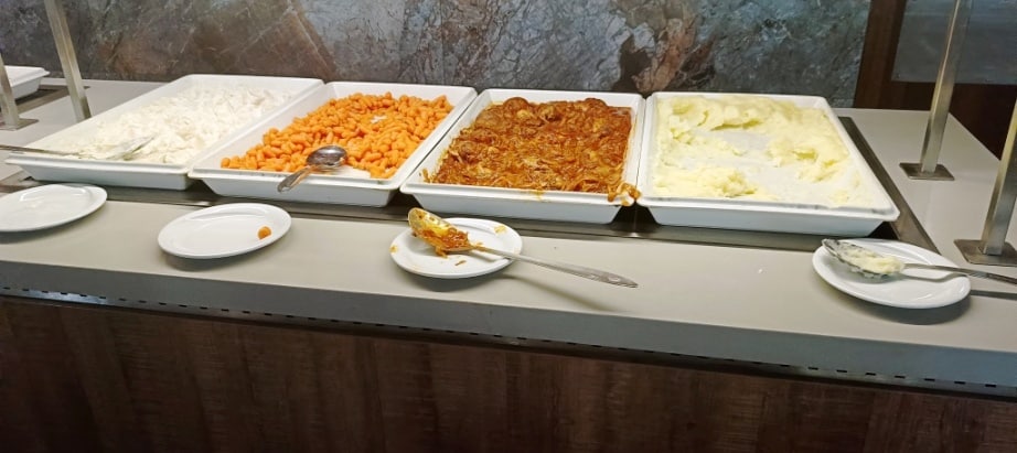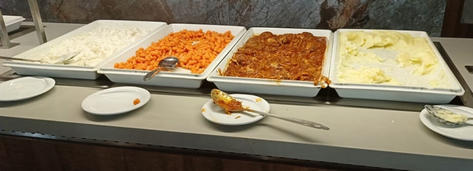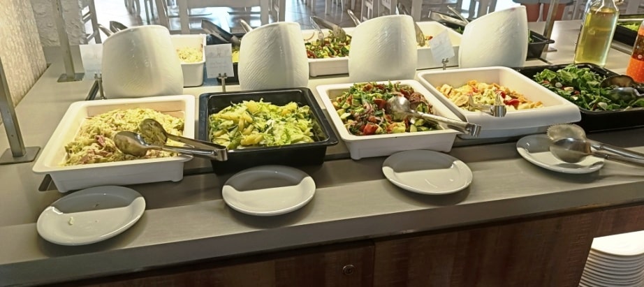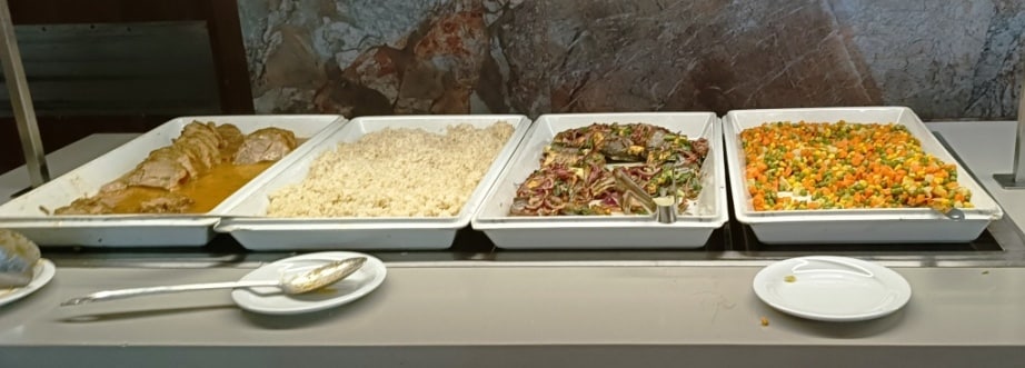 Posiłki to stała zimna płyta plus zmieniające się dania na ciepło. Przykładowy obiad to – z ciepłych potraw – do wyboru: